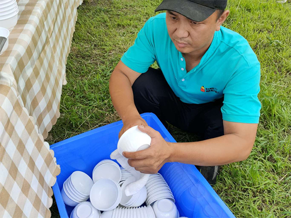 6月1日,雅福經濟三中心團隊在蒲公英基地戶外婚禮自助餐的忙碌準備中,廖勇以實際行動詮釋了什么是真正的服務。